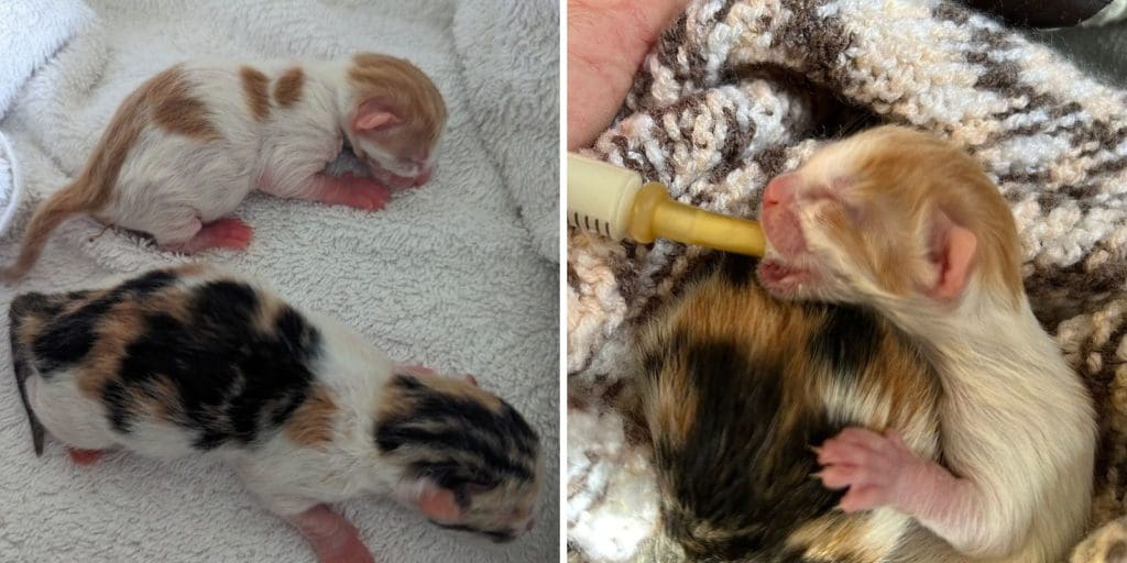 “The two kittens are just so tiny – they can both fit in the palm of my hand. They are probably the smallest kittens I have ever had. Over the weekend they have been feeding well and are now around four days old.”