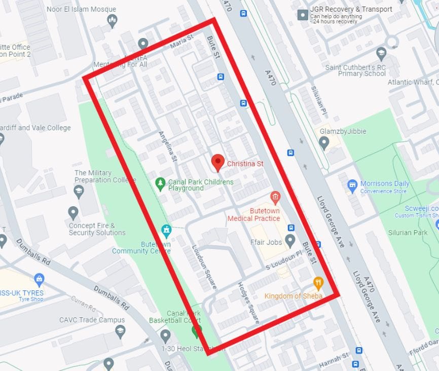 South Wales Police have issued a Section 60 Notice, which gives them the power to stop and search anyone in this area of Butetown in Cardiff.