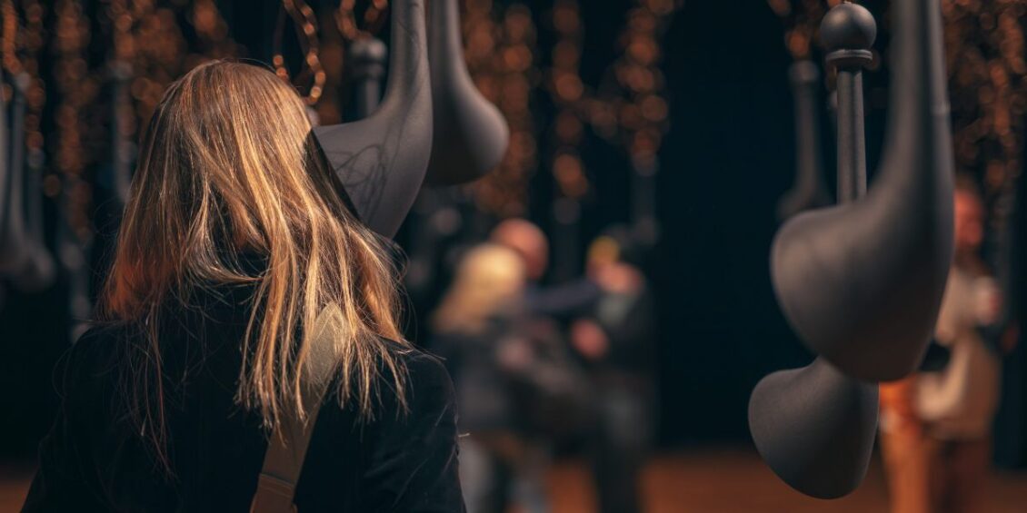 Belief System features contributions from Cardiff residents including asylum seekers, school children, farmers, artists, students, office workers and many more. The installation consists of 92 sculptural speaker cones hung from above like inverted trumpets bringing the listener into a murmeration of beliefs. The views shared by citizens of Australia and Wales flock together and are programmed to both whisper from the speakers and flow above and around the listener building rhythms and patterns as they go. The beliefs vary every day, sharing different volumes, different thematic views, moving across the installation controlled by live data from a weather station on top of Chapterʼs roof.