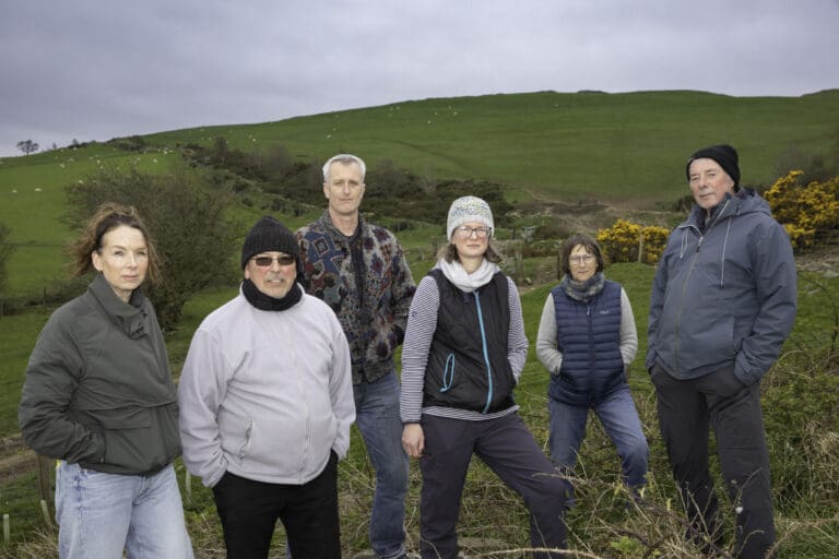 Also fighting the plans for the proposed 180-metre high wind turbines are, from left, local residents Charlotte O’Brien, Hywel Jones, Dr Steve Newon, Kate Wright, Janet Jenkins and Steve Davitt. Picture Mandy Jones