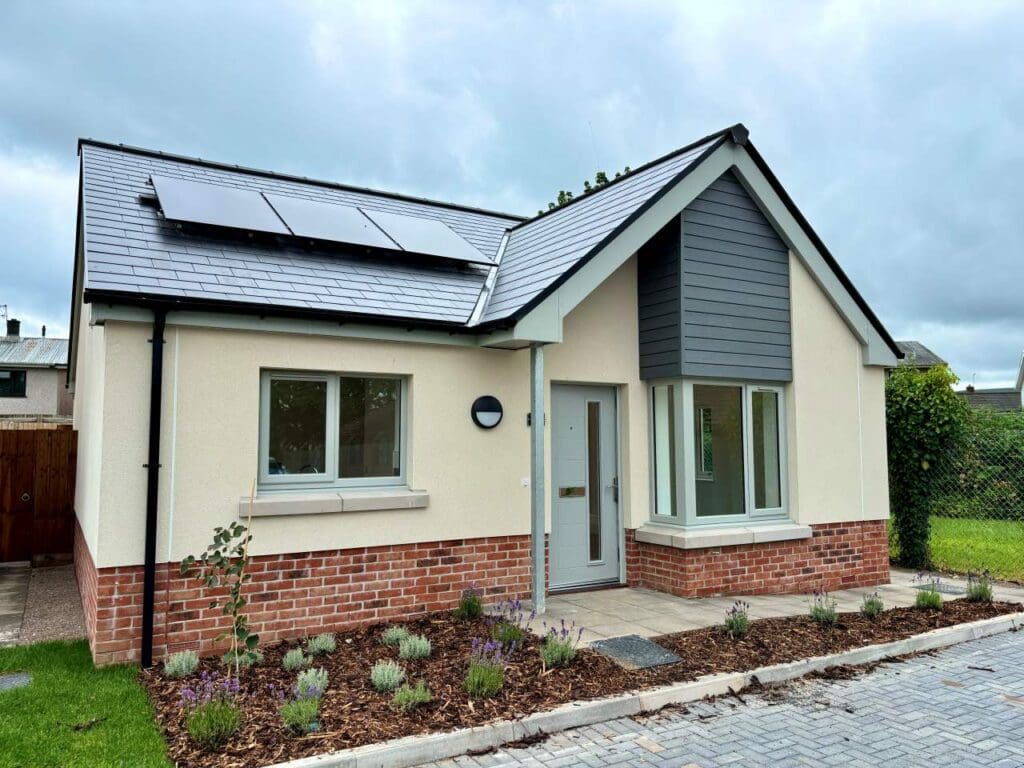The two-bedroom bungalows have been built with high insulation and have achieved the top energy efficiency rating of EPC-A. Air source heat pumps supply heating and hot water instead of gas, and solar panels on the rooves convert sunlight into electricity to power the homes, reducing the impact on the environment and lowering energy bills for residents.
