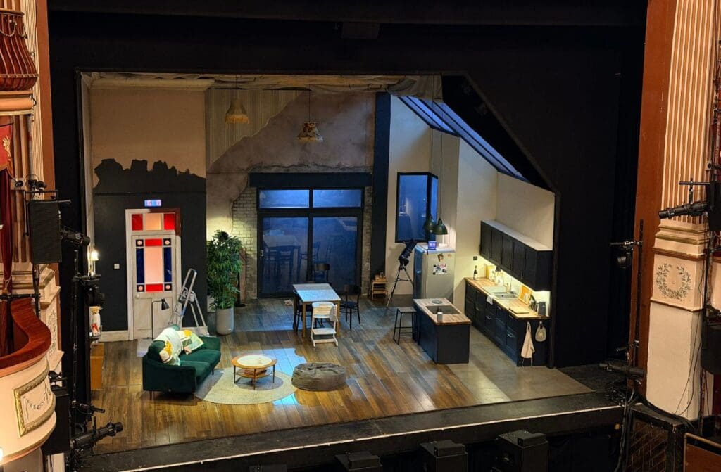 At its heart, this is a single set play. The entire production takes place in one living space. A newly renovated older property, the kind you would easily picture in Pontcanna or Llandaff. Period charm, modern touches, the sense of history in the walls. The attention to detail is remarkable. Children’s toys scattered around, a high chair tucked beside the table, mugs of coffee, the fridge humming quietly in the background, even a small modern garden beyond the doors. It feels real. Completely lived in.