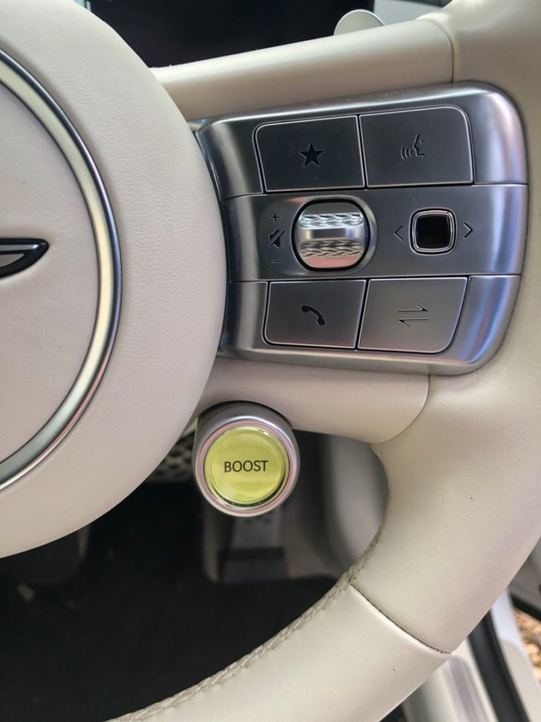 The controls for the infotainment system were split between the console and a big touchscreen in the centre of the dashboard, and they were not particularly quick operating or at times as clear as they could have been when a lot was being shown infront of you. The driver’s screen was large and very clear by comparison, and its displays changed with the selection of eco, normal or sport settings on the mode button and accompanying boost button giving ten seconds of kidney-kicking acceleration.