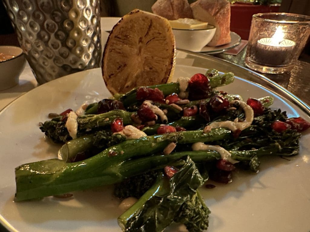 - Charred broccoli tahini and lemon, harissa, cranberry pearls, toasted with winter seeds