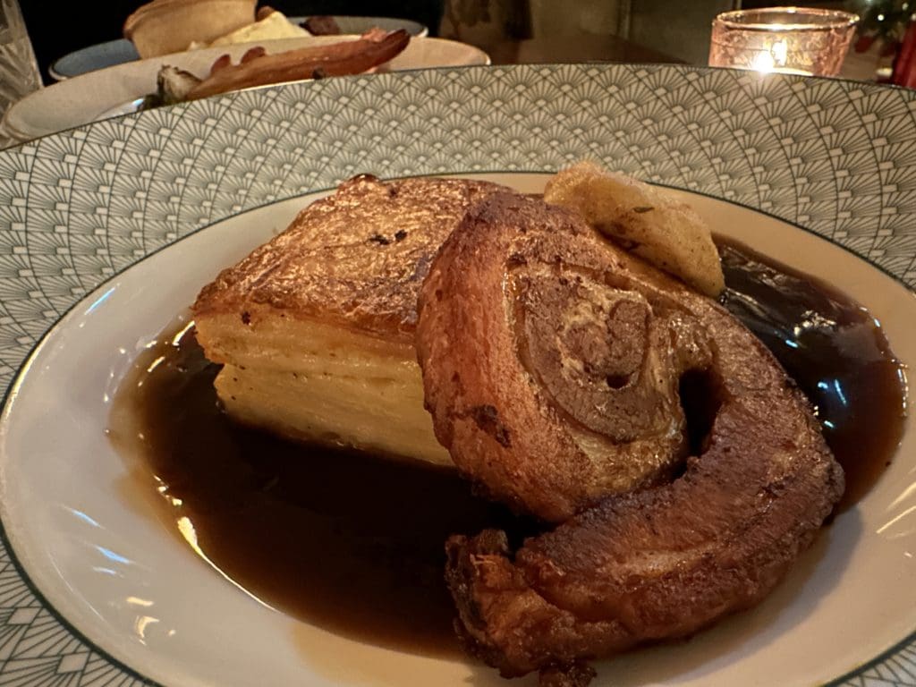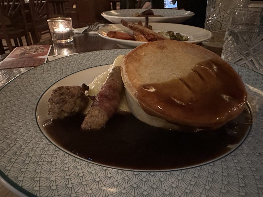 For mains, it’s difficult not to go for the turkey dish, especially when it sounds so delicious and is a twist on the traditional cooked dinner. We tried the roast turkey & smoked bacon pie and the slow-roasted pork belly.