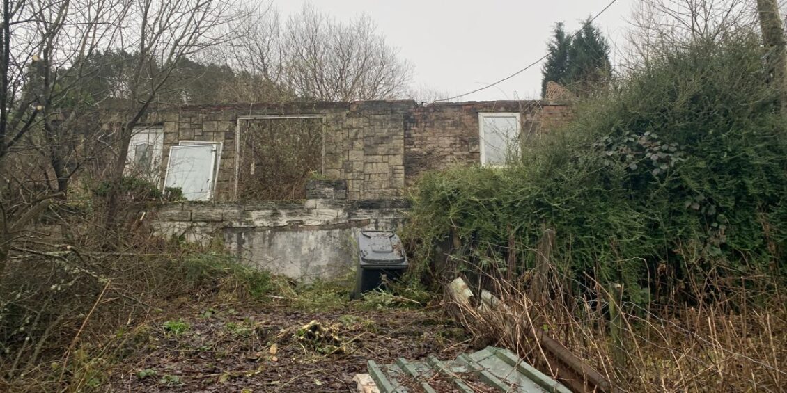 “Viewing has proved to be a challenge as we have had to cut a path through overgrown brambles, bushes and bracken, just to reach the derelict bungalow which is in a dilapidated and unsafe condition. We’ve not been inside and wouldn’t advise prospective buyers to do so due to the dangerous condition of the building.”