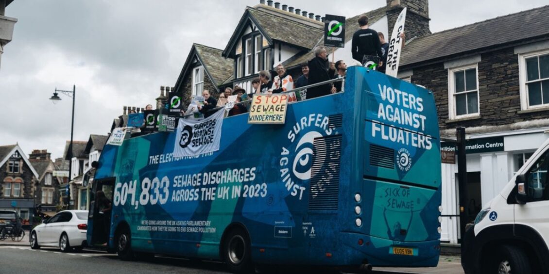 The bus will make its first stop on Monday 17th June for a demonstration at Windermere, which made headlines earlier this year after toxic algal blooms in the lake were linked to sewage pollution. The first hustings will take place in Edinburgh the following day (Tuesday 18th June), and events are scheduled over the subsequent ten days in locations such as Plymouth, Reading and Hastings.