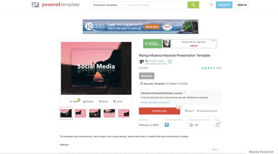 Now, let’s take a look at one of the downloadable options available for Apple Keynote. When a template is selected, it’s possible to see plenty of information accompanying the design. Firstly, we can see more information about the rating system for the content. Here, the ‘Rising Influence Keynote Presentation Template’ has received an average rating of 4.5 stars from 243 reviews since it was created in February 2020. We can also see that it will be downloadable as a ZIP file.