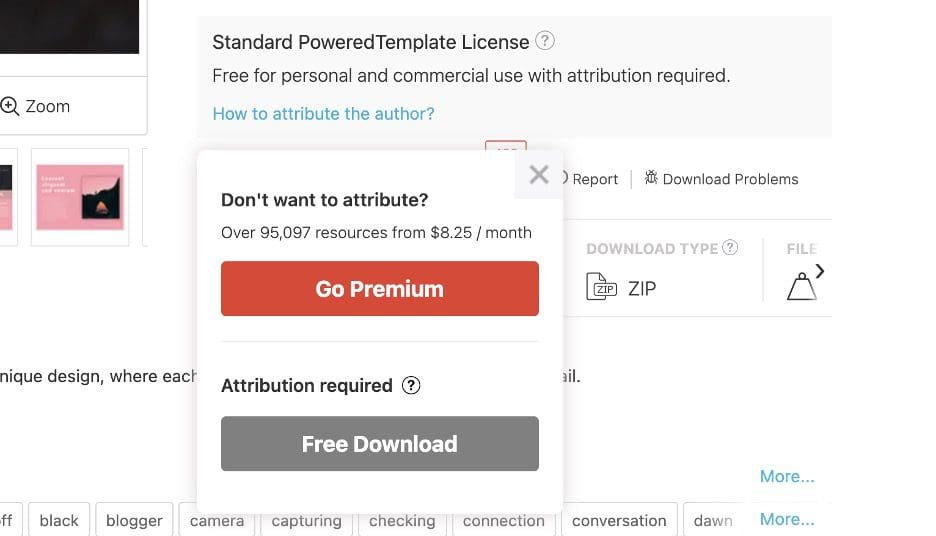 In the case of our example template, it’s actually an entirely free resource that doesn’t require any form of sign up or financial commitment to download – only a simple attribution that can be placed within the content itself.