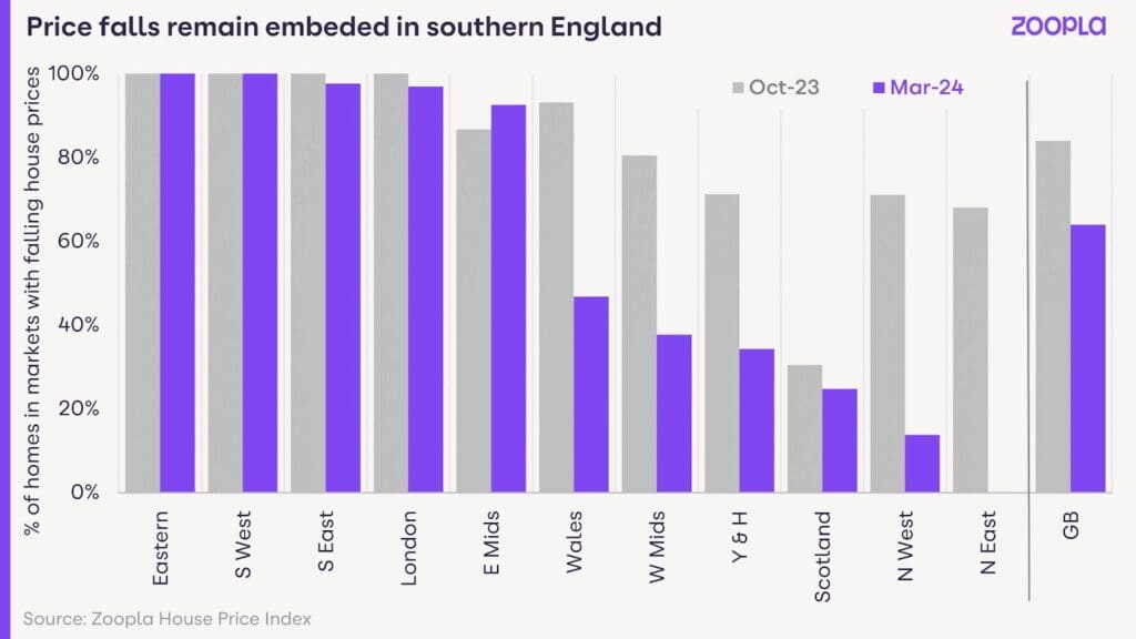 The coverage of homes in markets with price falls is greatest across southern England where 95-100% of homes are now in local markets with annual price falls. The East Midlands also has a high proportion of markets with price falls at 93%.