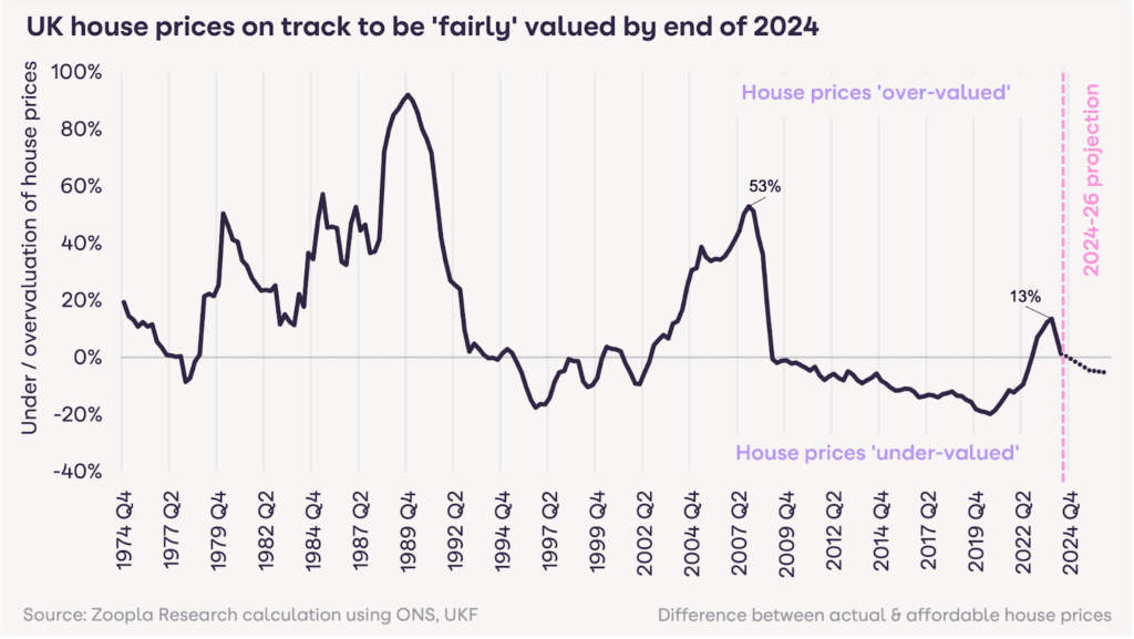 Zoopla has a long run model that tracks whether UK house prices are too expensive or fairly valued. This highlights how UK home prices were more than 50% over-valued in the run up to the global financial crisis in 2007, and even more over-priced in the late 1980s housing boom. In both these cases, economic recession led to double digit house price falls.