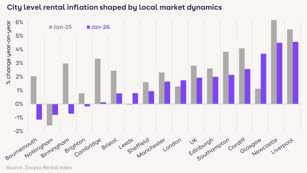 Rental growth remains stronger in the more affordable markets in Northern England and Scotland, with certain cities seeing increases of 3%-4%+, as demonstrated by Liverpool and Newcastle recording growth of 4.6% and 4.5% respectively.