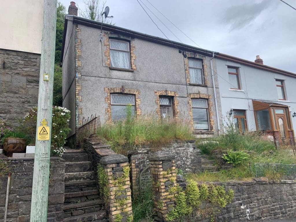 “The house currently has a lounge, kitchen and bathroom area and the three bedrooms. There is an overgrown front garden with a storage area under the steps and a steeply sloping overgrown rear garden.”