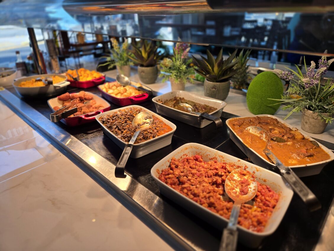 For those craving something warm, the hot dishes cater to vegetarians, vegans, and the adventurous eater. Savour the crispy delight of Banana Milanesa, the sweet richness of roasted plantain, or dive into the hearty ‘Carne com Batata‘, a traditional Brazilian beef stew. We tried the ‘Cogumelos Cremosos’—creamy mushrooms with a medley of tomatoes, onions, sweetcorn, green peas, mustard, herbs, and spices. And don’t forget to sample some of the best new potatoes you’ll ever taste.