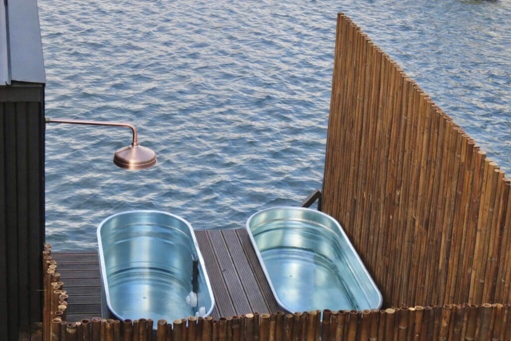 Guests can also experience contrast therapy in the professional-grade ice baths located on the pontoon, alongside an outdoor cold shower.