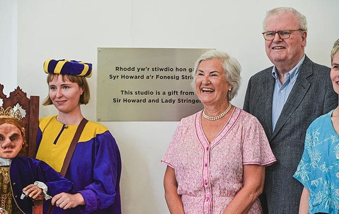 Sir Howard and Lady Stringer visited the Old Library today with College staff, students and guests while the College’s new puppetry performance for families, Giant, was in rehearsal. Students and puppet characters joined Sir Howard in the unveiling of the plaques naming the Sir Howard Stringer Studio.