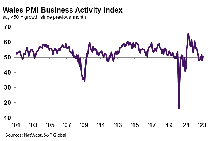 Welsh firms recorded a second successive monthly fall in employment midway through the first quarter. The rate of job shedding quickened to a solid pace that was the fastest since January 2021. Subdued demand conditions reportedly drove the latest fall in workforce numbers, as firms did not replace voluntary leavers, and some staff were let go amid cost cutting measures. Of the 12 monitored UK areas, Wales registered the sharpest decline.