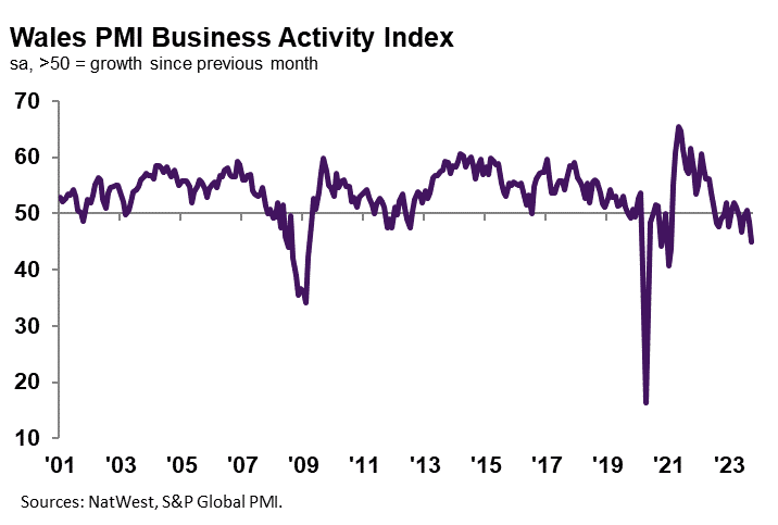 Welsh private sector firms signalled a marked decline in new business at the start of the fourth quarter. The rate of contraction accelerated notably to the fastest since early 2021. Moreover, of the 12 monitored UK areas, only Yorkshire & Humber recorded a steeper drop in new order inflows.