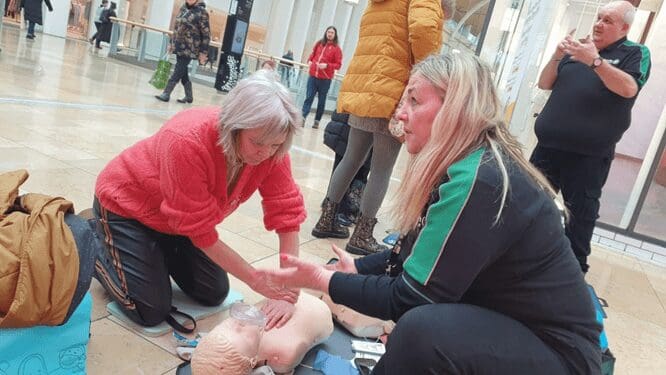 St John Ambulance Cymru held free defibrillator awareness training sessions in communities throughout Wales over the course of February, from Divisions holding training sessions in their local halls, to demonstrations being held on stalls in busy shopping centres. This included stands at Cardiff’s Red Dragon Centre and St David’s shopping centre, in which people of all ages were supported by trainers to learn basic AED and CPR skills.