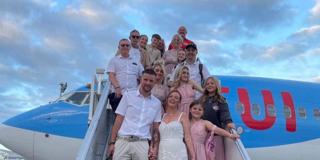 Childhood sweethearts Rhiannon Simmonds and Joe Lewis from Wales delighted passengers on board a TUI flight from Bristol to Tenerife by flying in their wedding attire. The couple were joined on the plane by their eight bridesmaids, three groomsmen, three page boys, two best men and one maid of honour.