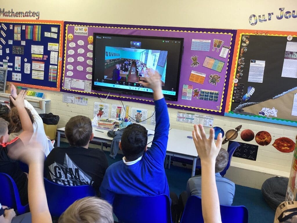Pupils from Tir-y-berth  Primary School taking part in an online session with their partner school Lysychansk School No. 1