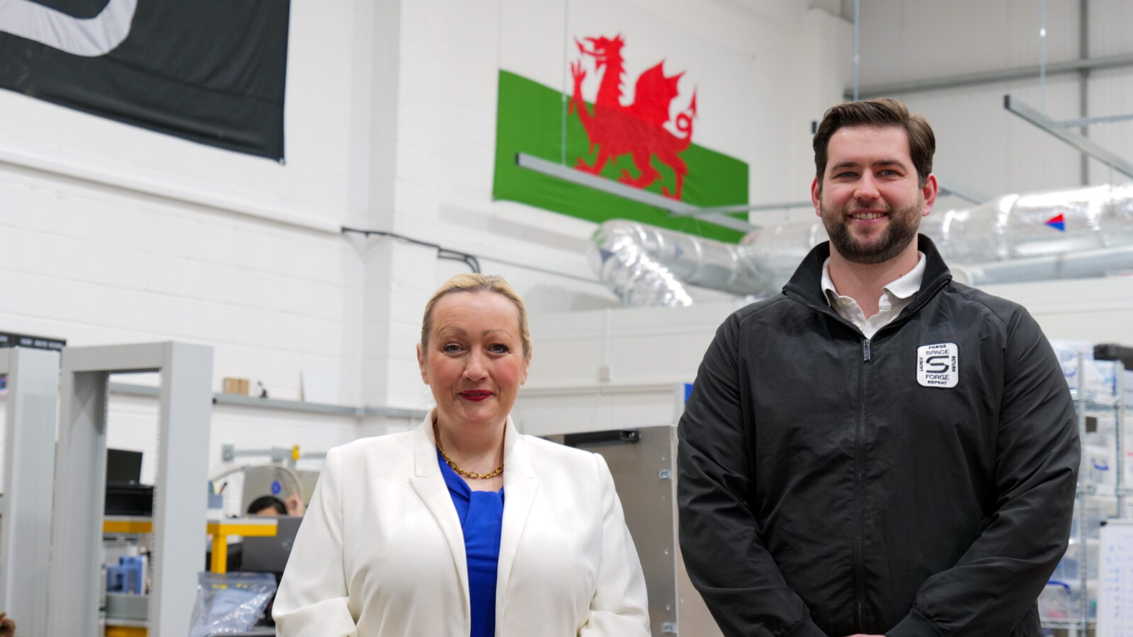 Economy Secretary Rebecca Evans with Joshua Western, CEO and Co-founder of Space Forge