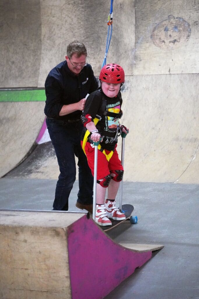 Dr Ross Head, Cerebra Innovation Centre Lead, said: “We wanted to enable Ollie to go skateboarding, but importantly, we wanted him to skate with other children and on equipment that looks the same as theirs. The gantry system was a huge undertaking, but we were confident that Ollie and many other children will be able to learn to skate and enjoy the comradery of the skatepark.