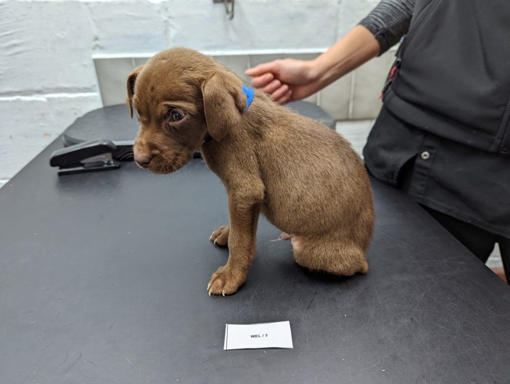“Their ribs and spines were prominently visible but their abdomens appeared slightly swollen; indicating a likely high worm burden, as a recent meal was not reported to have been given. All the puppies were very quiet throughout their examination so a spot blood glucose level was obtained from them all to ensure this was adequate which it was.”
