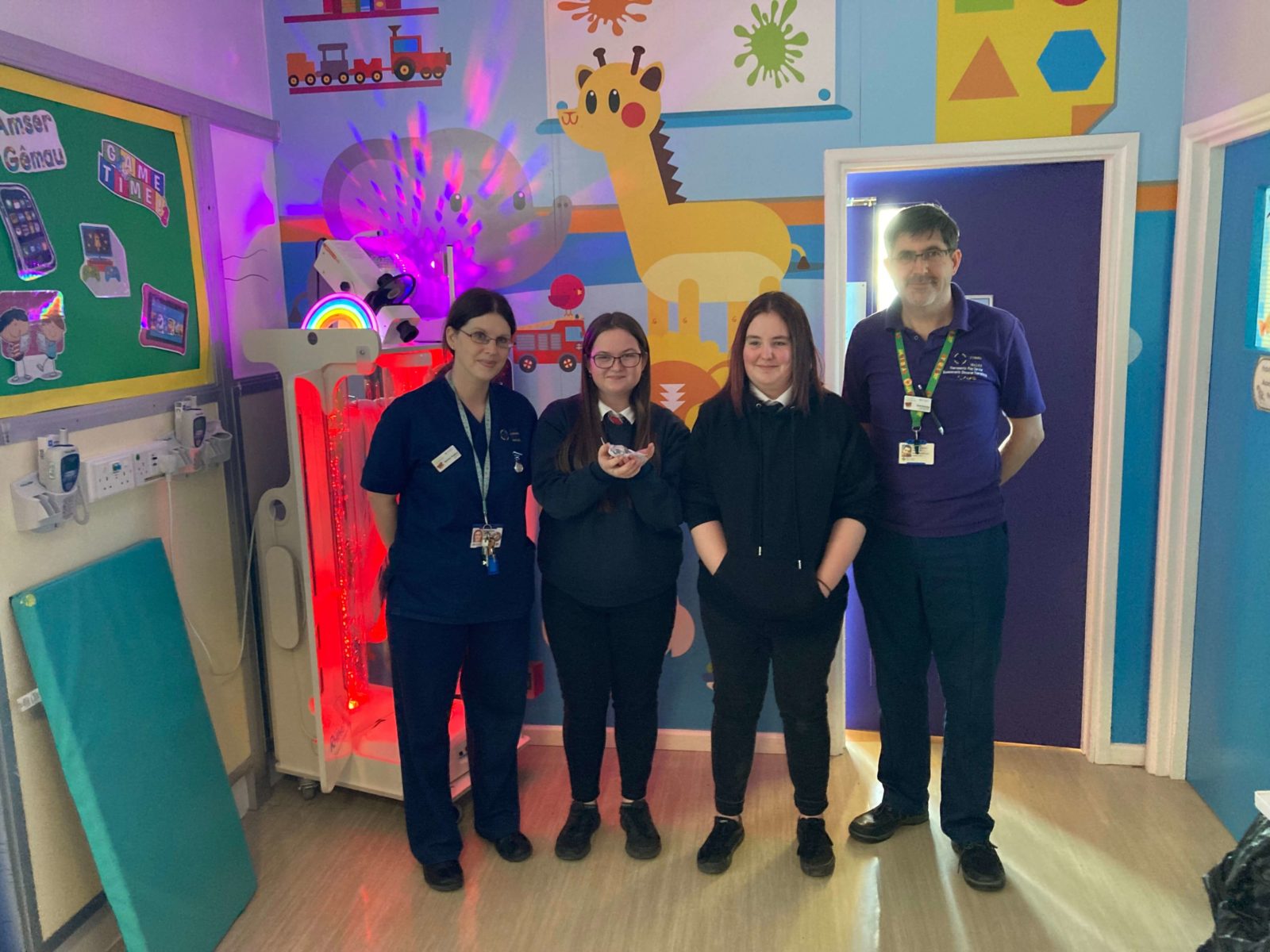 Mari and Scarlett who are members of Aberaeron Youth club presented the money to the ward and said: “The Angharad Ward offers great care and support to many children and young people and it was great for us to be able to give a little back to them and their wonderful staff.”